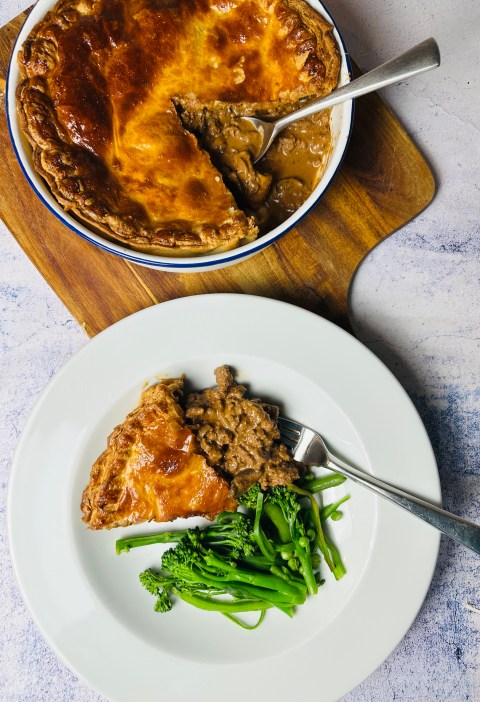 This Beef & Blue Cheese Pie is pure comfort in a dish — rich minced beef simmered with caramelised onions, mushrooms, dark ale, and herbs, then finished with cream and melting Stilton for a bold, velvety filling. Wrapped in a crisp shortcrust base and topped with golden puff pastry, it’s a hearty, indulgent pie that’s perfect with chips, mash, greens, or a spoonful of onion gravy. A proper classic with a delicious blue cheese twist.