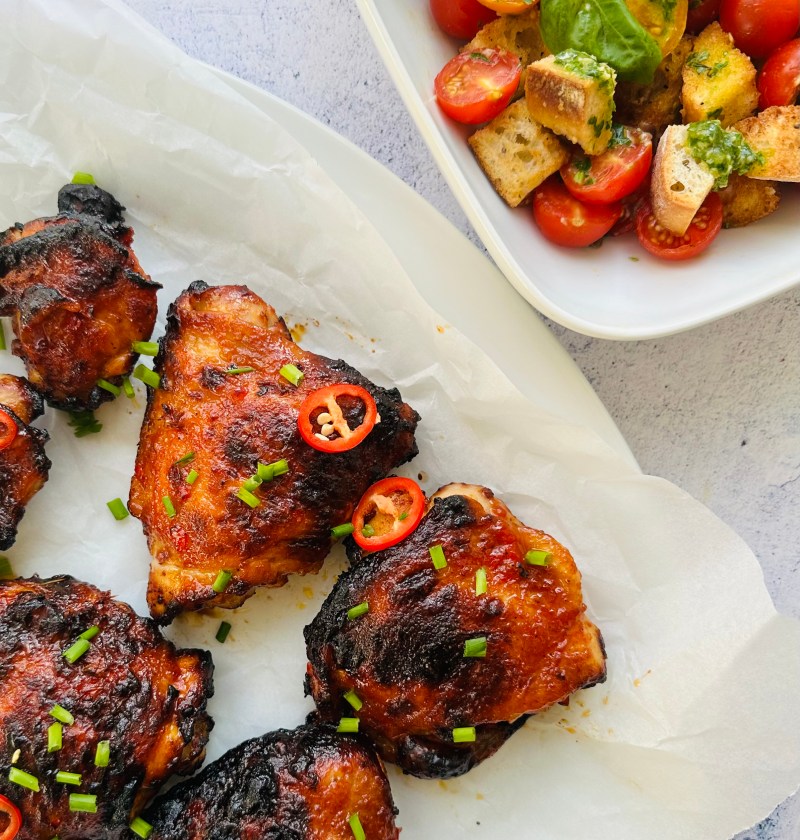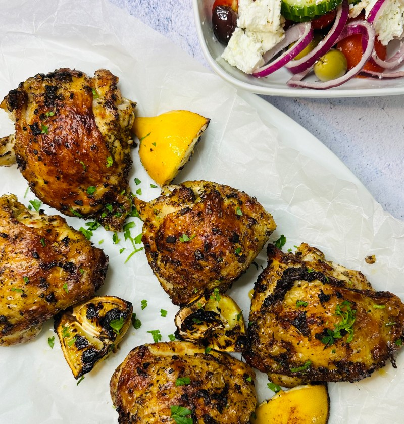 Tender spiced chicken thighs, marinated in warm Middle Eastern spices and seared to perfection, served on soft toasted flatbreads with a dollop of creamy yogurt and a fresh, zesty side salad. The salad combines crisp greens, juicy pomegranate seeds, crumbled feta for the perfect balance of savoury, sweet, and sharp. It’s a flavour-packed, vibrant dish that’s ideal for sharing — or keeping all to yourself.