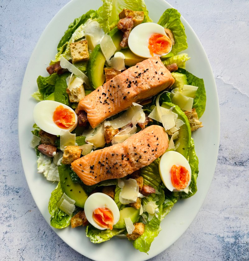This Salmon & Avocado Caesar salad is so tasty! Crispy pan fried Salmon fillets are a beautiful addition to this salad – especially with creamy avocado slices, crunchy croutons and shavings of Parmesan cheese.