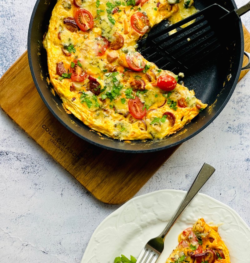 Enjoy a tasty and delicious brunch or lunch in less than 30 minutes. Liven up your frittata with chorizo, peppers blue cheese and a kick of chilli, then pop under the grill until puffed and golden – delicious!