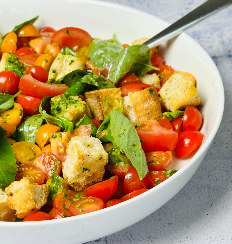 This classic Italian Panzanella salad is a celebration of summer flavours and rustic charm. Crunchy golden ciabatta soaks up a zesty dressing made with fresh basil, garlic, white wine vinegar and tomato juices, while ripe vine tomatoes add a burst of juiciness. Anchovies bring a savoury depth, and a touch of Dijon mustard gives the dressing a gentle kick. Finished with extra basil and a generous glug of extra-virgin olive oil, it’s a vibrant, satisfying salad that’s bursting with flavour …