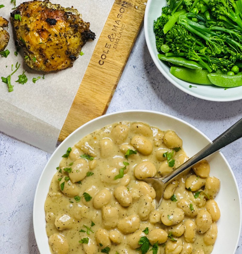 Creamy butter beans coated in a deliciously rich sauce of melted Parmesan and cracked black pepper. This is a quick and flavourful dish, perfect as a side or a light main. I served this with lemon & herb roasted chicken thighs and seasonal vegetables but I could have ate the butterbeans alone (all to myself).