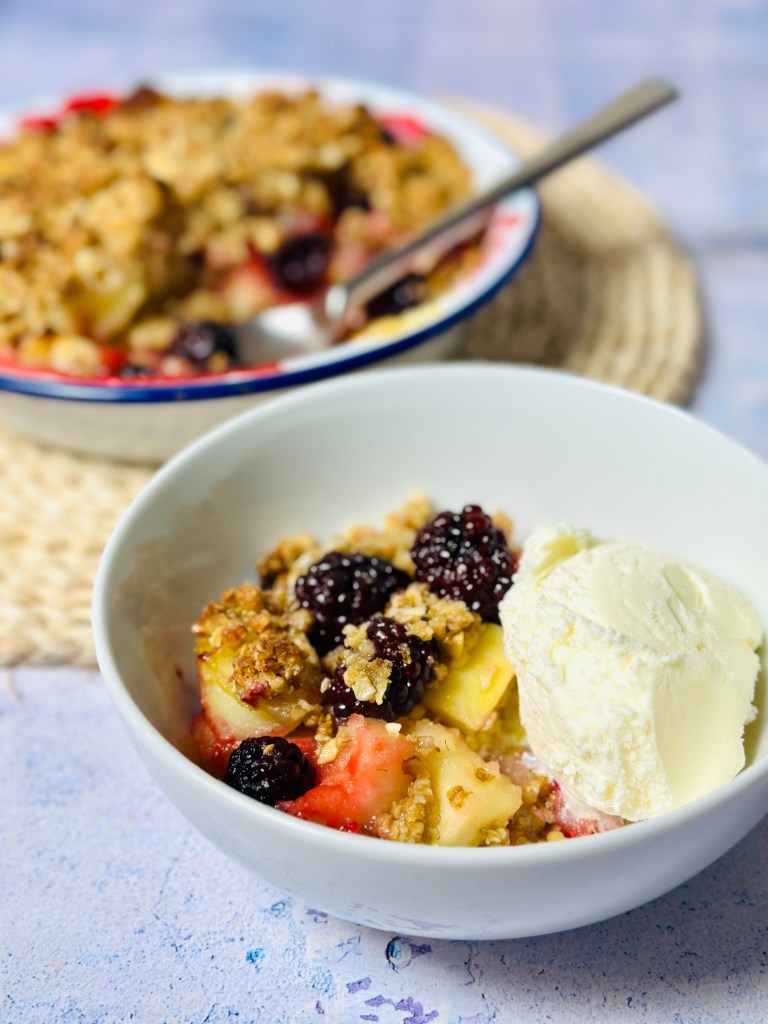 This crumble delivers – a warm, fruity apple and blackberry crumble topped with a golden, crunchy oat and mixed nut topping—perfectly sweet, nutty, and comforting!