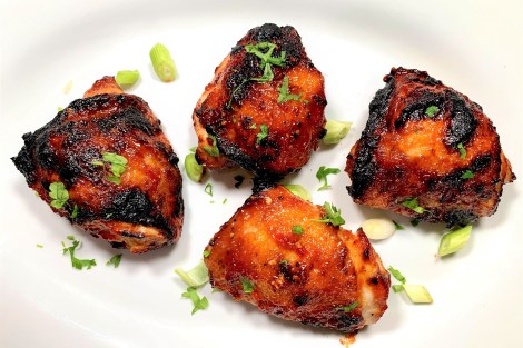 - If using a grill pan or grill, put it over a high heat to get it steaming hot. Use tongs to transfer your chicken onto the grill or grill pan. For chicken about 1 inch thick, cook for about 5 minutes on each side, turning and basting until golden and cooked through. Spoon a little of the reserved sauce over the chicken.
