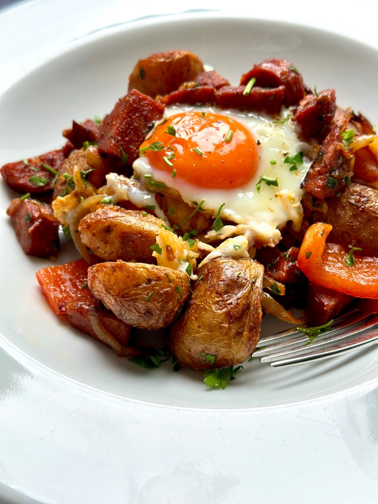 This chorizo hash is a great weekend brunch – it makes ideal comfort food and it’s so easy to make too! A wonderful recipe for a last-minute brunch or lunch.
