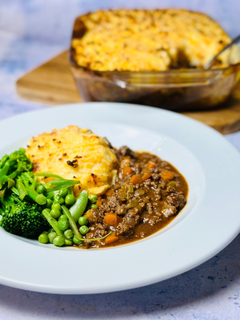 This Cottage Pie with a Cheesy Horseradish Mash is comfort food with a kick! The rich beef filling is slow-cooked with red wine, thyme, and a hint of redcurrant jelly for a deep, savoury flavour. Topped with creamy mashed potatoes mixed with mature cheddar and a touch of horseradish, it’s baked until golden and bubbling. A classic family favourite taken to the next level.