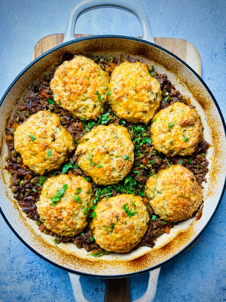 When the mince is ready, season to taste. Now drop the dumplings on top, sprinkle with cheese and cover with the lid and place in the oven for 30 minutes.