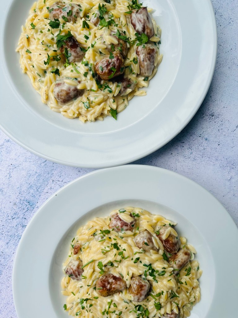 This recipe is so easy and can be made in less than 30 minutes. Delicious cheesey & creamy Orzo Pasta served with your favourite sausages.