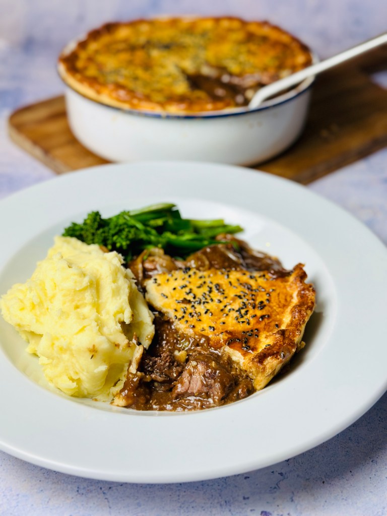 This hearty Steak & Ale Pie is filled with tender slow-cooked beef simmered in ale, herbs and rich beef stock. Sweet caramelised onions and crumbled Stilton melt into the gravy, creating a creamy, indulgent filling with incredible depth of flavour. Topped with golden pastry and served with mash and seasonal veg, it’s the perfect comforting winter pie.